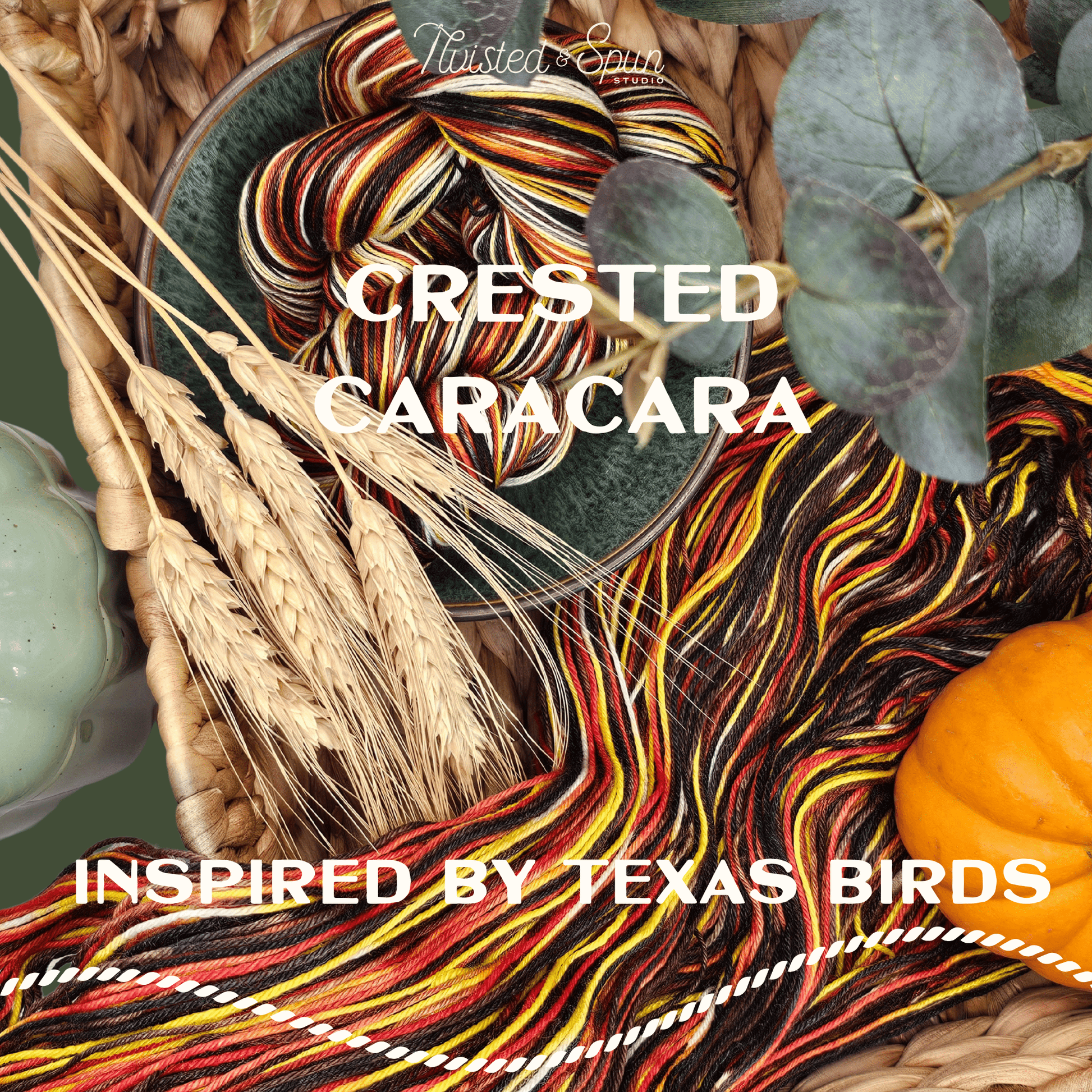 Rich black, earthy brown, and flashes of orange-gold echo the dramatic plumage of the Crested Caracara. Often called the “Mexican eagle,” this bird is powerful and distinctive, standing out in any landscape. The colorway brings that same striking presence to your stitches, bold yet wearable.