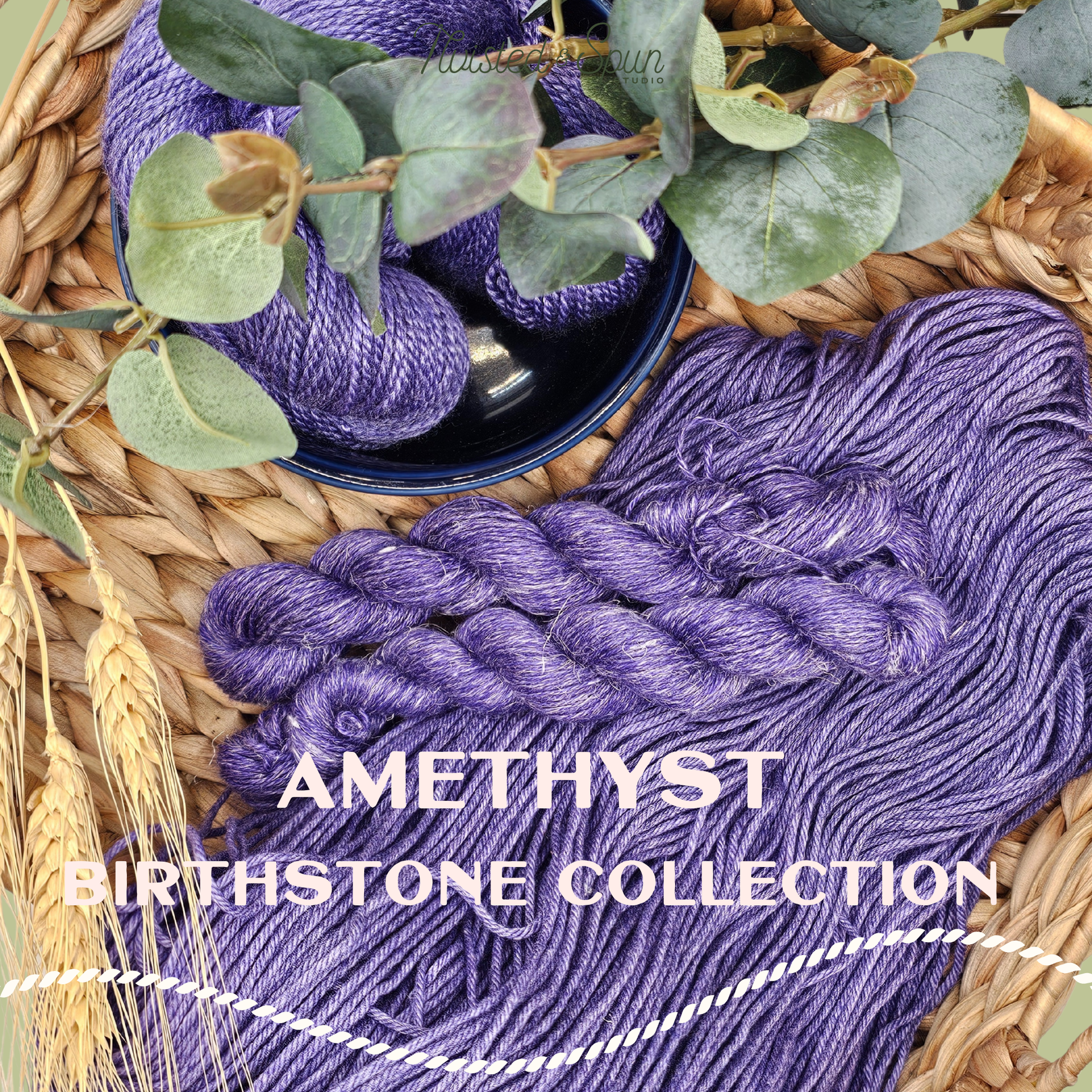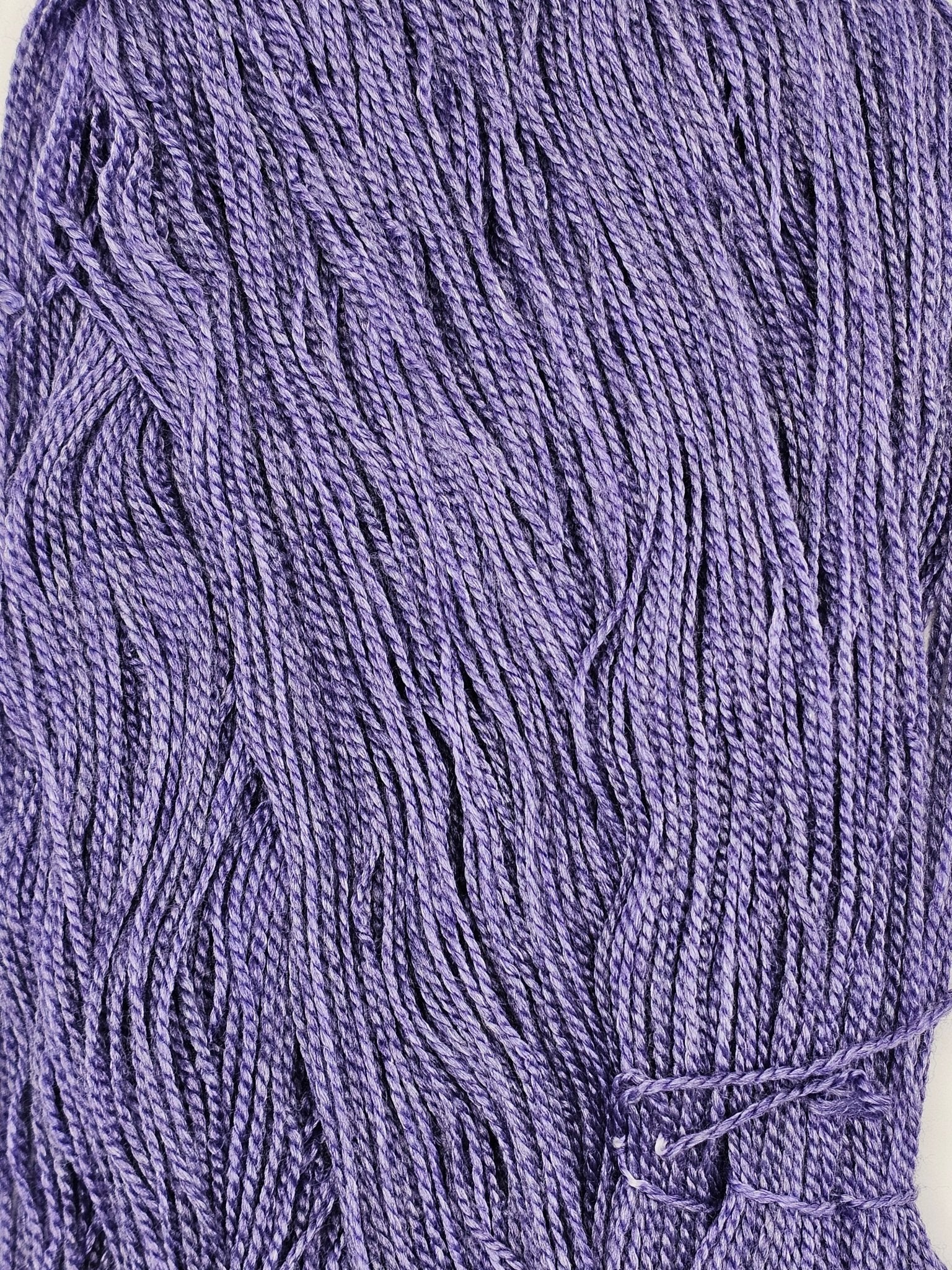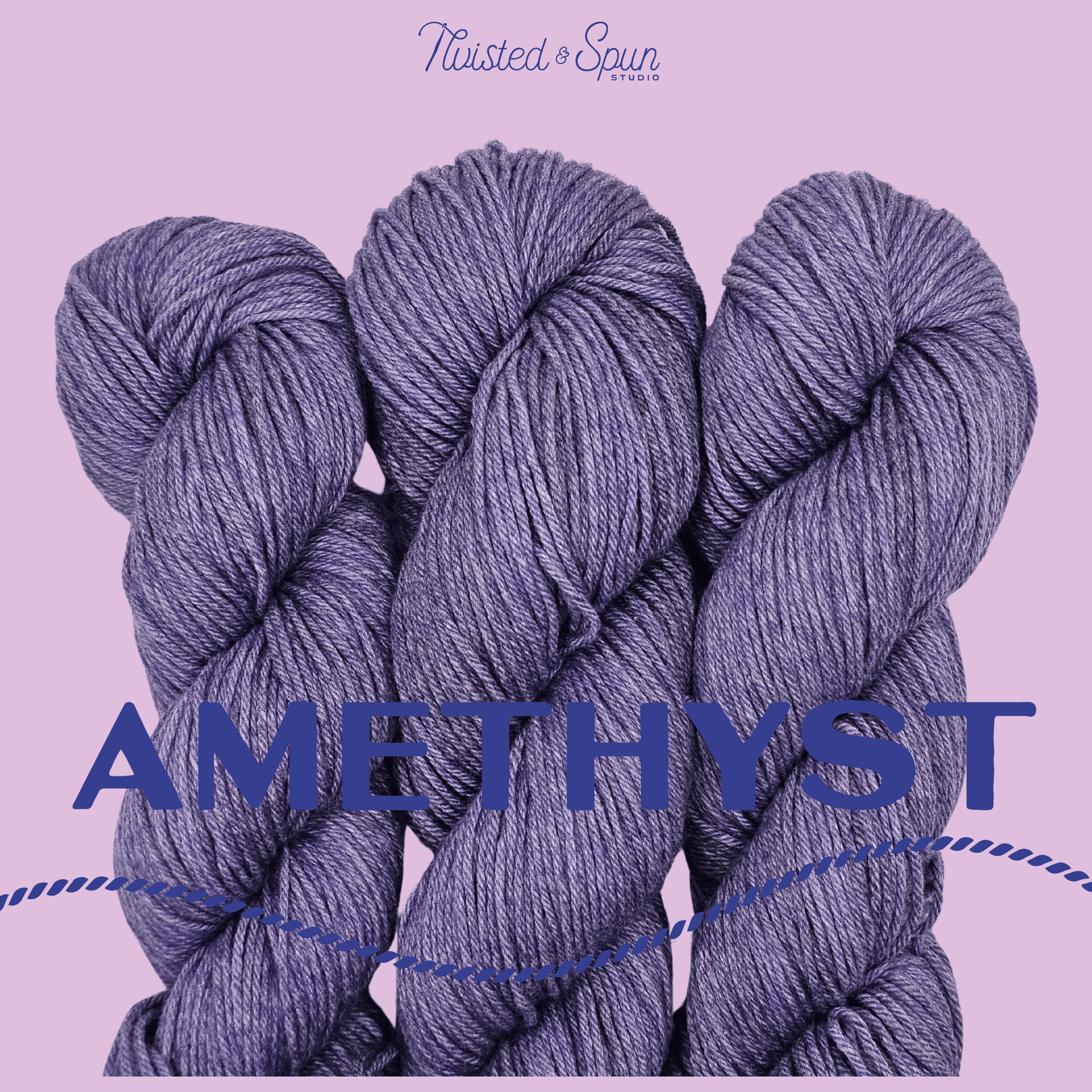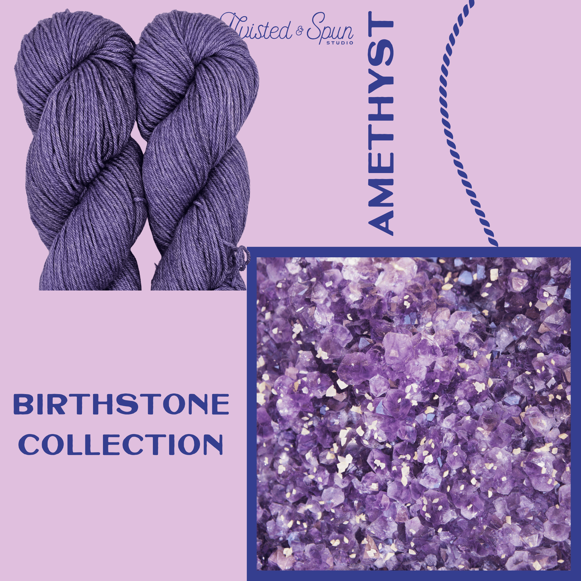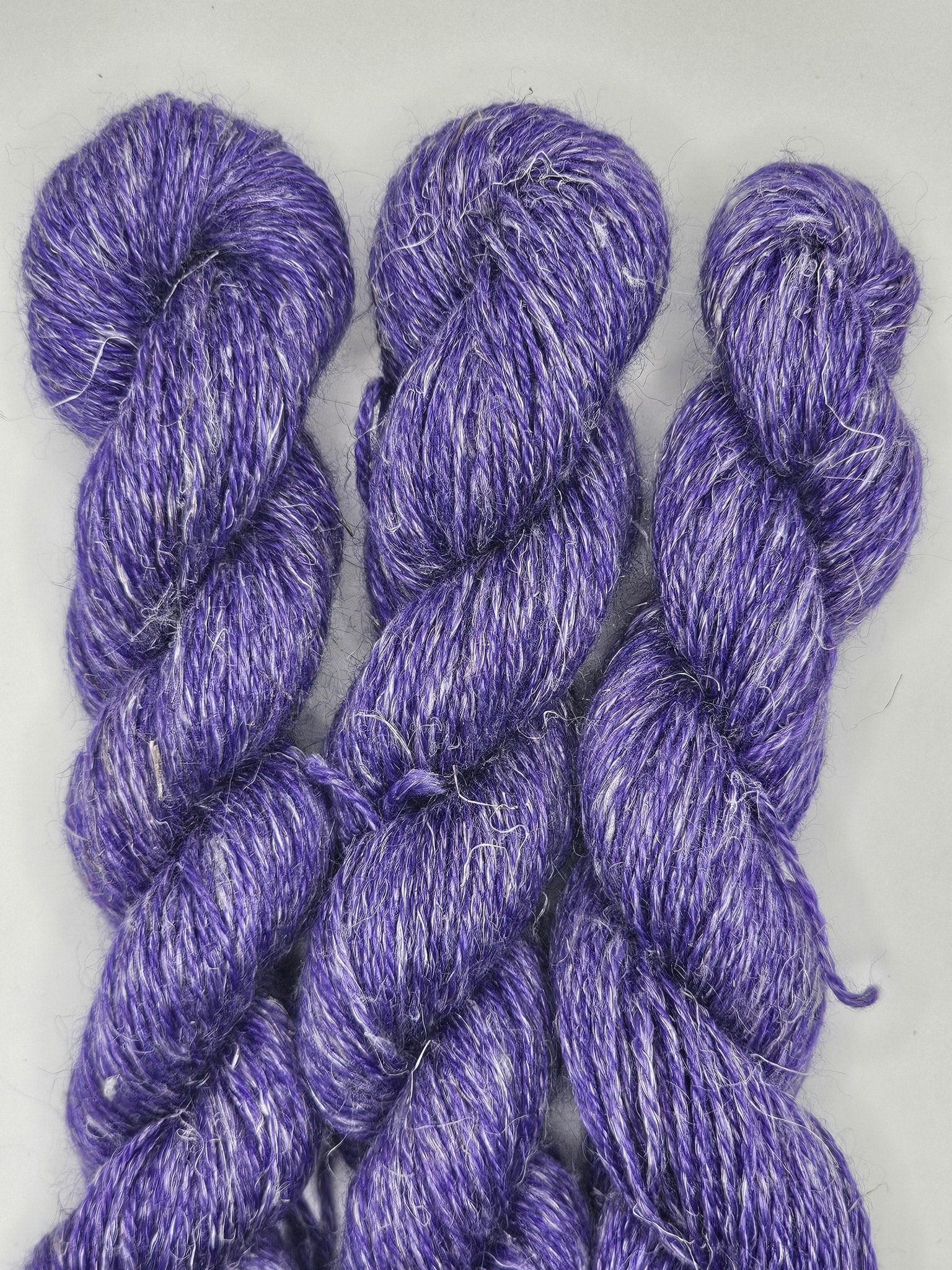 Amethyst is a deep, stone-true violet inspired by the classic purple quartz. This yarn shows layered tonal depth, with cool plum shadows and soft silvery highlights that shift gently as the fiber moves. The color reads rich and confident without feeling heavy, echoing the look of polished amethyst rather than high-shine sparkle.