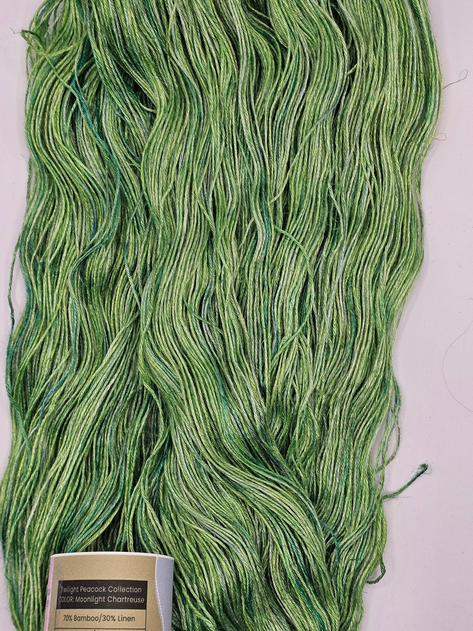 A pale, glowing chartreuse that feels like moonlight catching the first flash of iridescence on a peacock feather. It is bright, fresh, and softly luminous. As part of a six-skein gradient, Moonlight Chartreuse will merge in a fluid cascade, revealing the full spectrum of the peacock’s twilight glow - radiant, mysterious, and endlessly elegant.