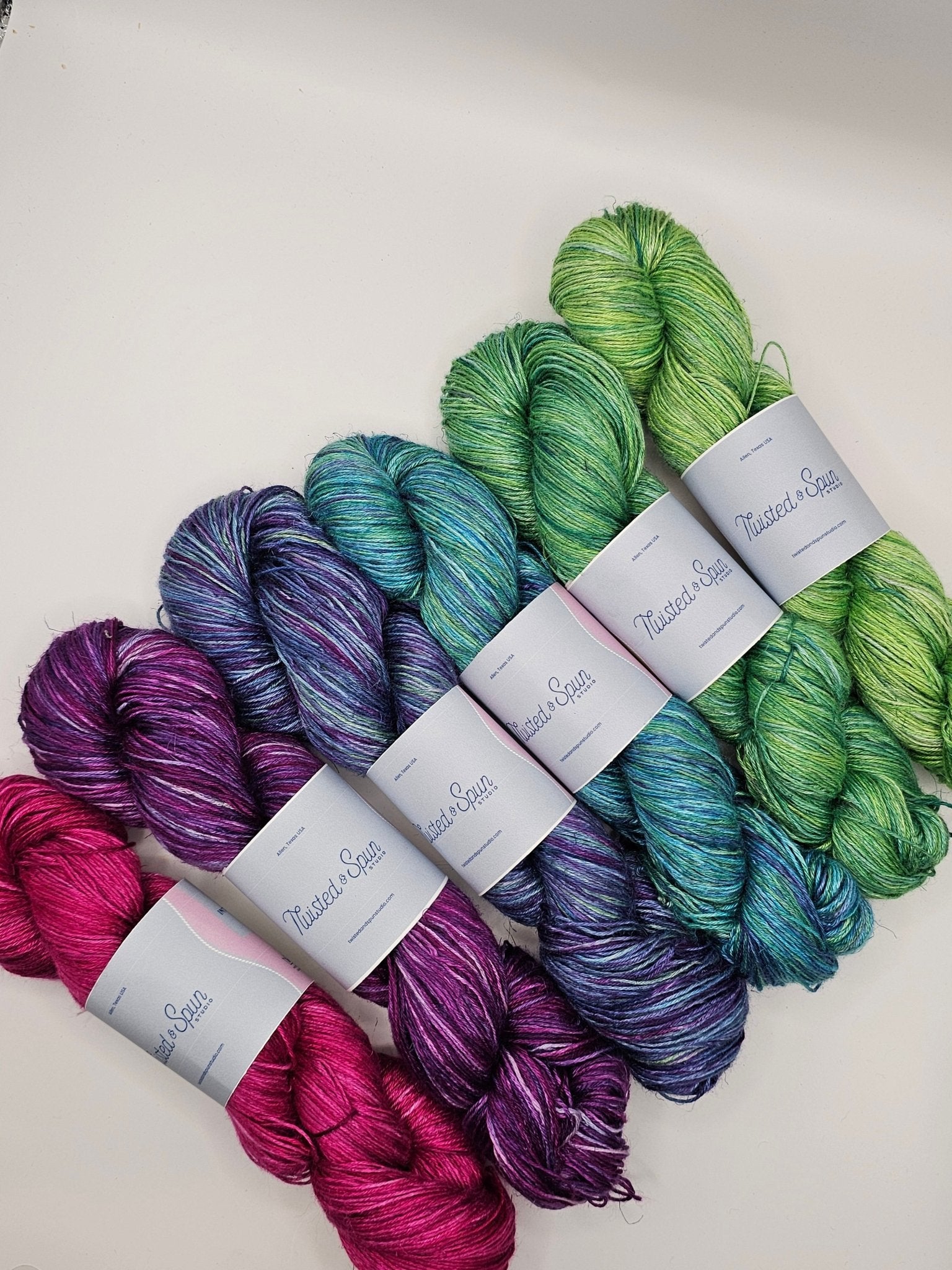Fiber Content: Umpqua - 75% SW Merino/15% Nylon/10% Tencel, Eco Sock - 80% Merino/20% Linen, Egyptian - 50% Alpaca/25% Silk/25% Linen, Palette -100% Peruvian Wool, Lindy Chain - 70% Linen/30% Cotton, 100% Organic Cotton, Vegan - 70% Bamboo/30% Linen, Tencel - 100% Wood Fiber, Cupro - 100% Recycled Cotton, Sparkle - 75% SW Merino/20% Nylon/5% Stellina
